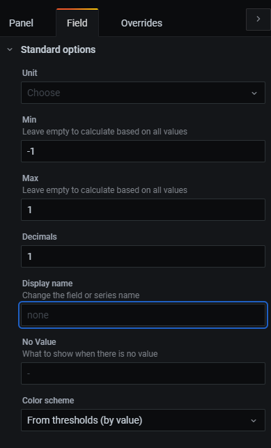 The latter is done in the Field tab under Standard Options. For the Sine value you can enter -1 and 1 for min and max values.