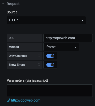In the Request panel of the configuration screen, enter http://opcweb.com for the URL, IFrame for the method and remove all of the text in the parameters field. Also, be sure to check “only changes” so the page will not reload unless you make changes to the parameters. Your entry should look like this: