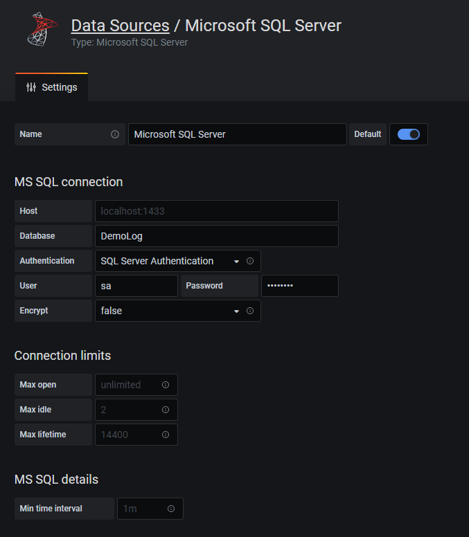 Click Add Data Source and then select Microsoft SQL Server under the list of SQL data sources. This will bring up the configuration options for the connection. As you can see here, I’ve selected localhost and DemoLog for the server and Database. I’m using SQL authentication and the sa account credential. For production systems it is best to create a credential in your database used specifically for access by Grafana.