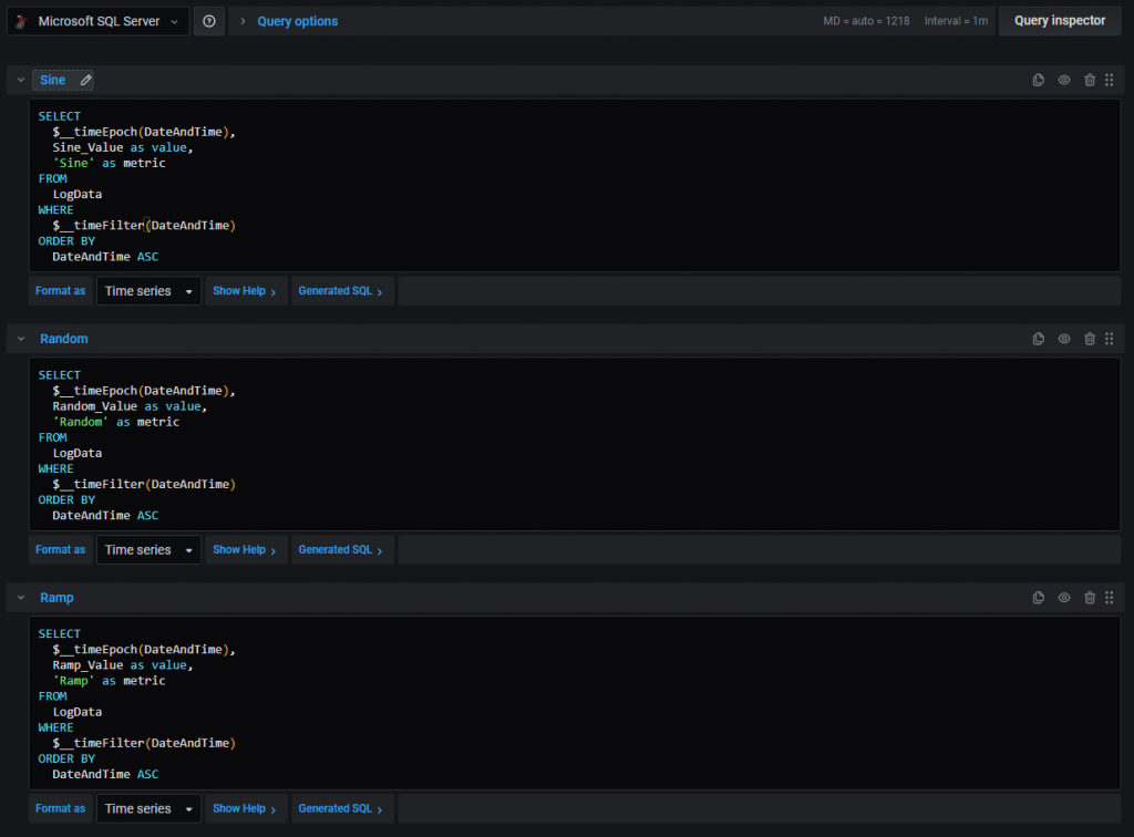 You can add the other series, modifying this query to change Sine_Value to Random_Value, or Ramp_Value, making sure to change the string ‘Sine’ used for the label to either ‘Random’ or ‘Ramp’.