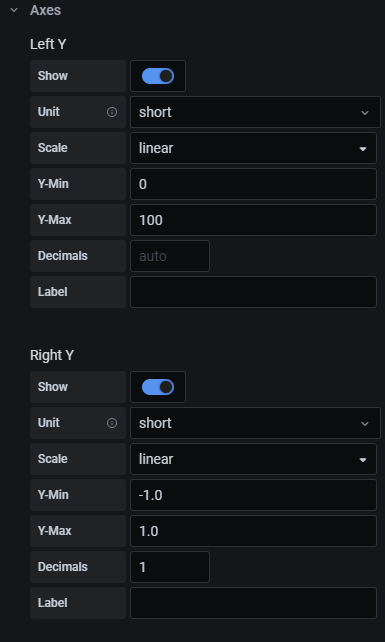 In the Grafana Panel settings on the right side of the screen, scroll down and expand the Axes section. Modify it with the following settings for left and right Y-axes: