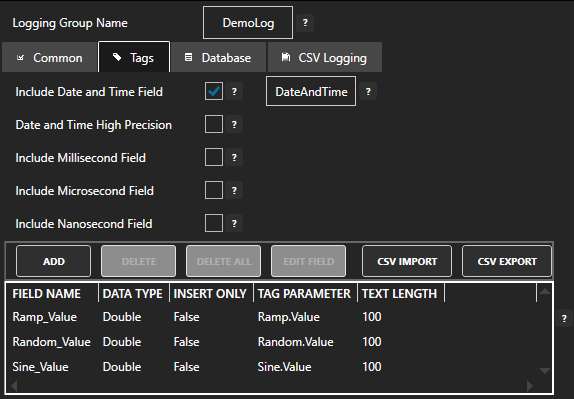 The tags we’ll be logging are Sine, Ramp, and Random, and we’ll be including a timestamp field called DateAndTime, as you can see from this screenshot:
