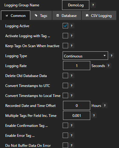 Once your OAS instance is up and running, we’ll add a data logging group to log three Tag values (Ramp, Random, and Sine) at a one second interval. The following screenshots display the necessary configuration. We’ll log to a Database called DemoLog and a table called LogData.