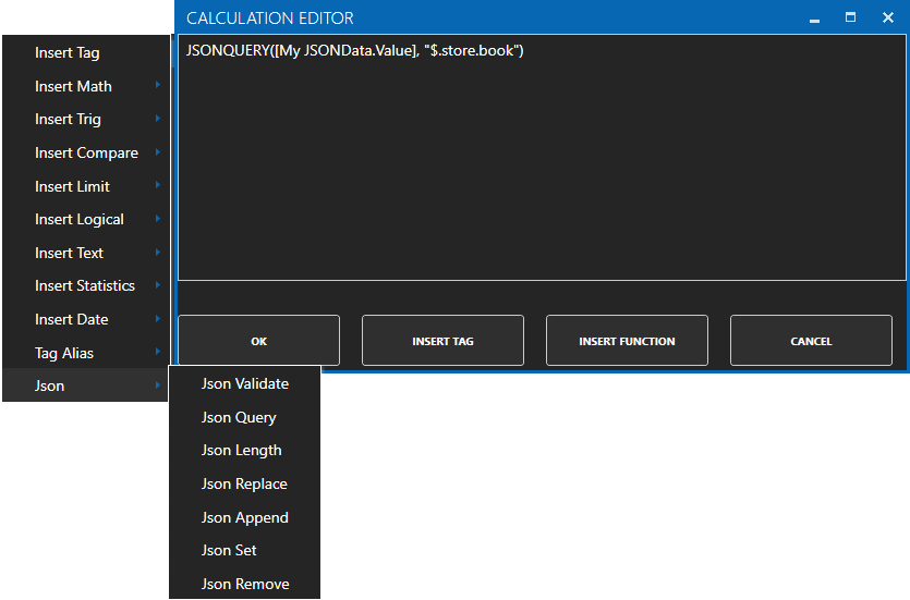 The OAS Platform Calculation Engine provides powerful features for real time data transformations and logic. Additionally, the Calculation Engine supports a set of functions for generating, querying, and manipulating JSON data. For example, if you create a tag containing a JSON structure, you can use the JSON Calculations to locate data points within the structure, add other structures to the JSON, and even set values on a particular node. See our documentation on JSON Calculations for more information.
