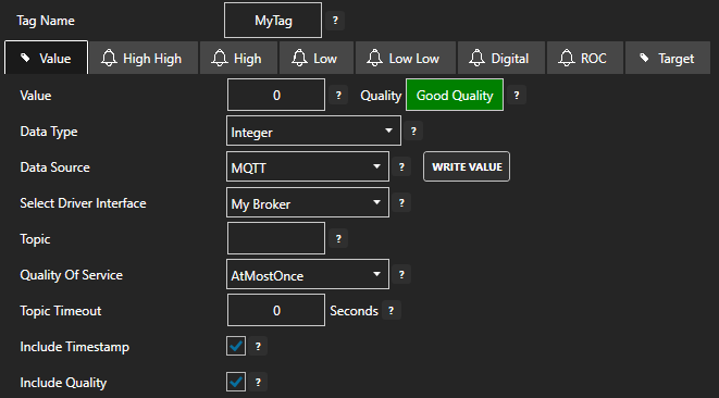 The OAS Platform built-in message payload for MQTT is simple and concise. The Tag’s current value, timestamp when the value changed, and the data quality of the tag are published as bare values in separate topics. For example, if your Tag name is MyTag, the topic of MyTag will contain the current value of the tag. In the configuration of a Tag with MQTT as the Data Source, you can also configure the topic name. Also, if you check “Include Timestamp” and/or “Include Quality”, an additional topic will be created for each.