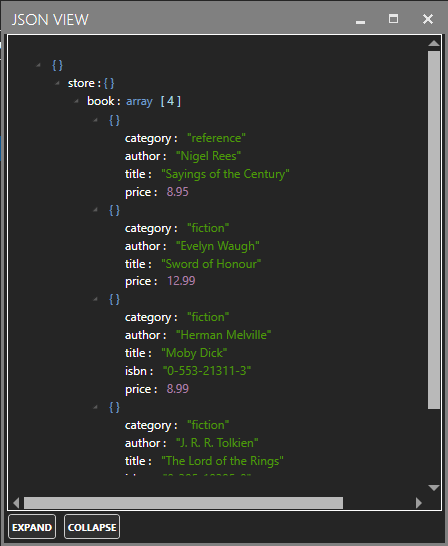 The OAS Configuration Application also has the ability to recognize JSON data and will assist with visualization. For Tags of both String and JSON Data Type, clicking on the current value will display the value in text form. If the value can be parsed as valid JSON, it will be displayed using a hierarchical JSON visualizer allowing you to expand or collapse nodes and arrays, as well as see the data with syntax highlighting.