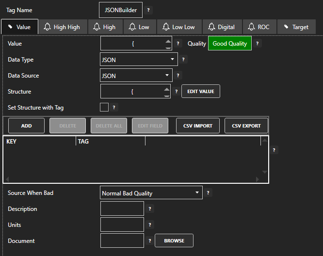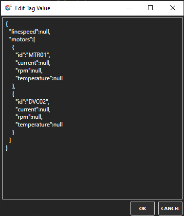 A Tag with a JSON Data Source can have a base Structure set directly as a valid JSON string, or it can be set using another Tag. This will allow you to dynamically modify the base structure, or use the same base structure for multiple tags. Below is an example of editing the JSON structure directly.