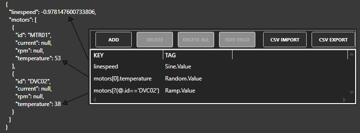 Assigning key/tag pairs are done in the by selecting Add in the table below the Structure property. This will open a Tag browser which allows you to pick a Tag from the local OAS instance or any reachable remote OAS instance. The key is a search parameter defining where to find the JSON node to fill with the Tag value. This key uses JSONPath syntax and can be either a direct path to the node or a dynamic query to find one or more nodes matching the criteria. For more information on JSONPath syntax, see this article.