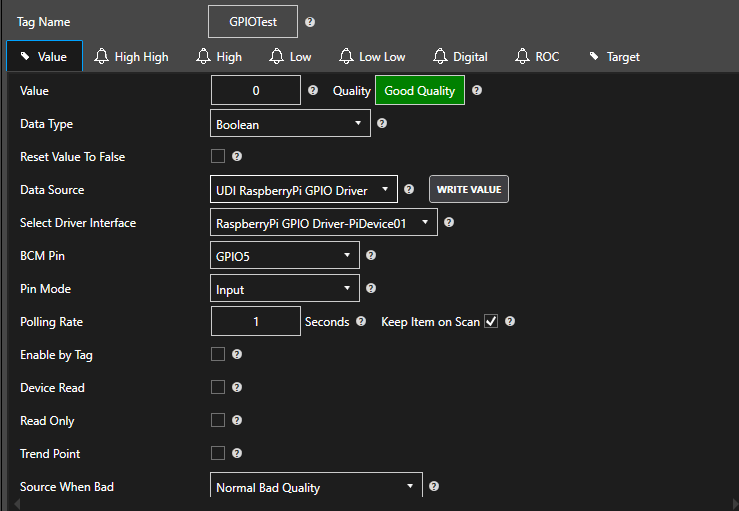 Another powerful feature of the UDI is the ability to define custom tag properties based on the driver. So when a Tag’s data source is selected as your UDI driver, your custom properties are displayed in the Tag configuration screen. In the case of the Pi GPIO UDI, we expose properties to control which GPIO Pin is mapped to a tag, and the data direction (input or output).