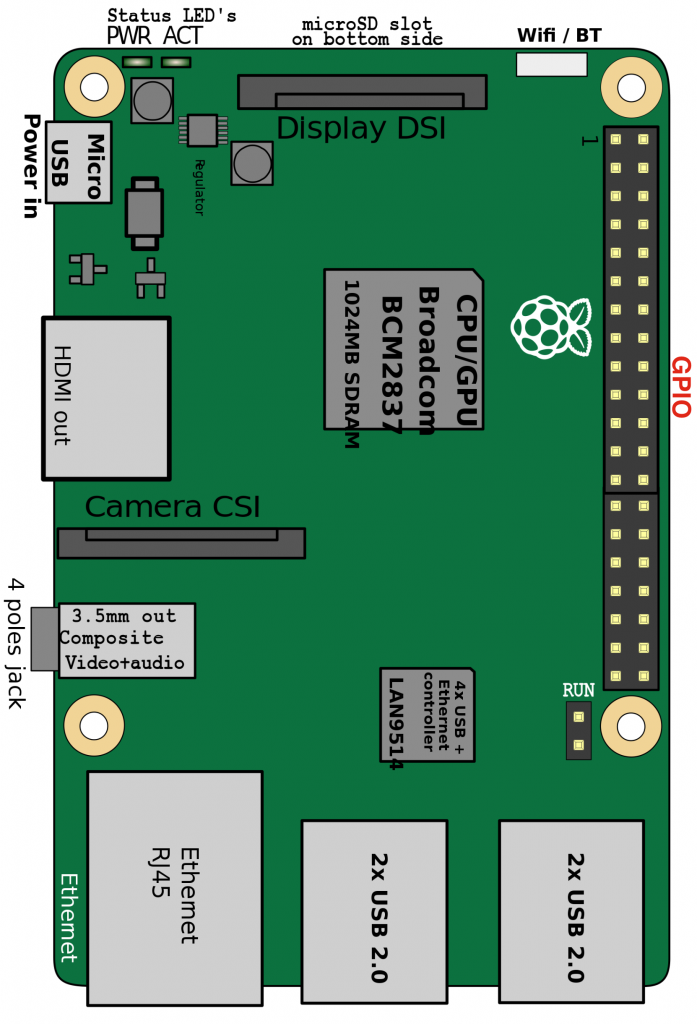In this diagram of a Raspberry Pi 3, you can see the bank of 40 GPIO pins on the right hand side. Older models only include 26 pins, and some models arrange them differently to fit on the PCB.